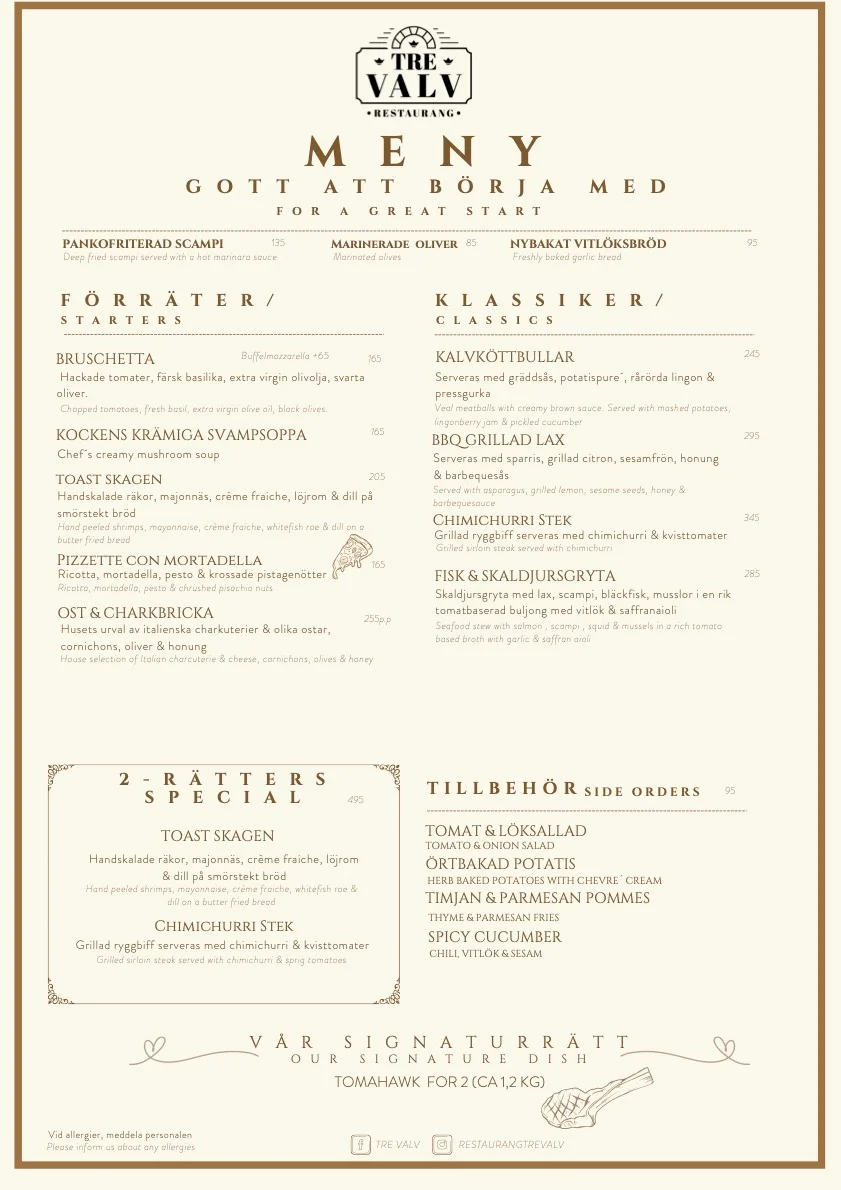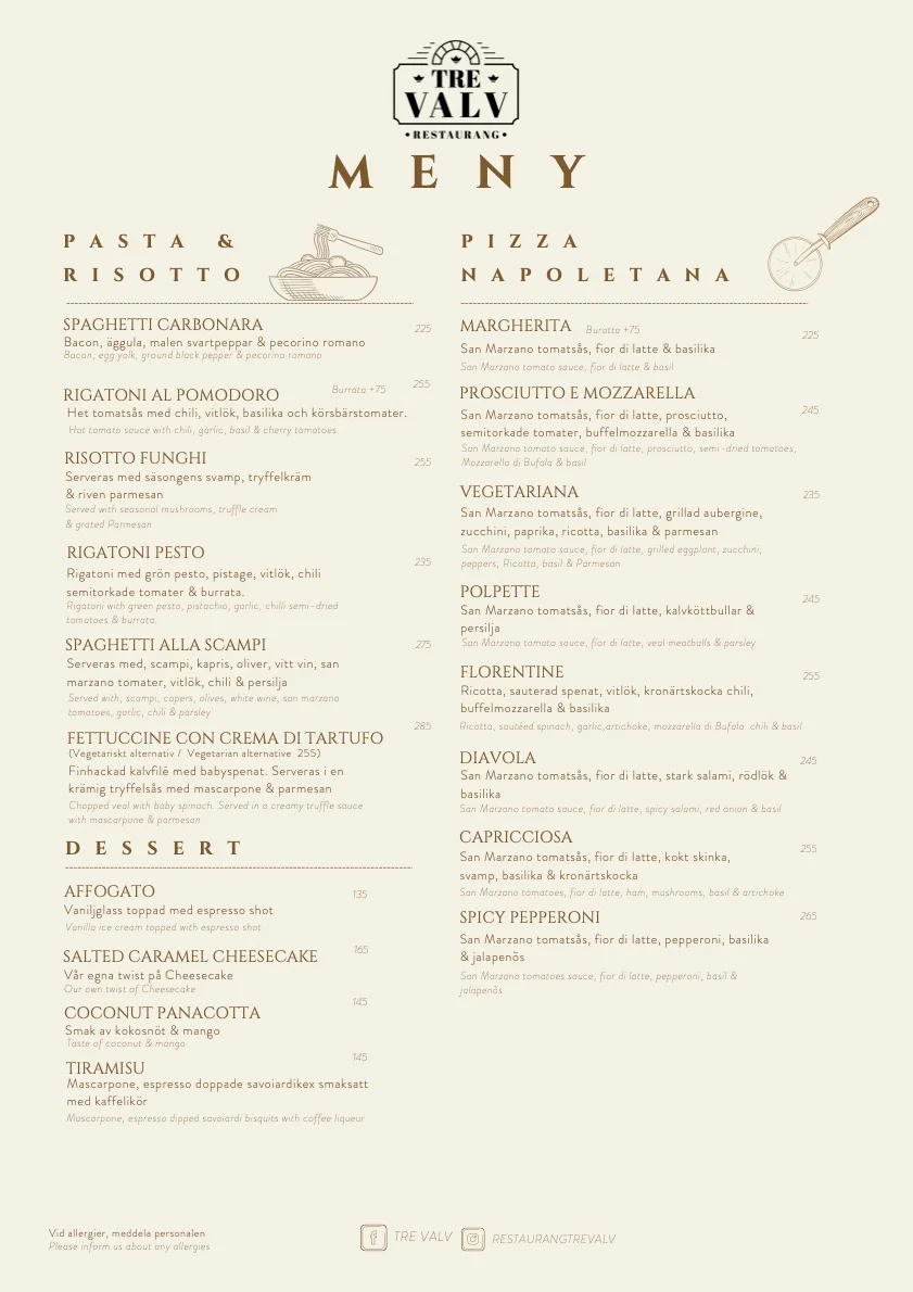 Här serveras allt från traditionella svenska köttbullar med gräddsås och rårörda lingon, till napolitanska pizzor vars deg har jäst till perfektion. Även för den som föredrar det lite lyxigare finns rätter som Spaghetti Carbonara med äkta Pecorino Romano och krispig bacon, eller varför inte en Fettuccine med tryffelsås? För den som avslutar måltiden finns sötsaker som Tiramisu och Salted Caramel Cheesecake, vilka säkerställer att du lämnar Tre Valv med ett leende.